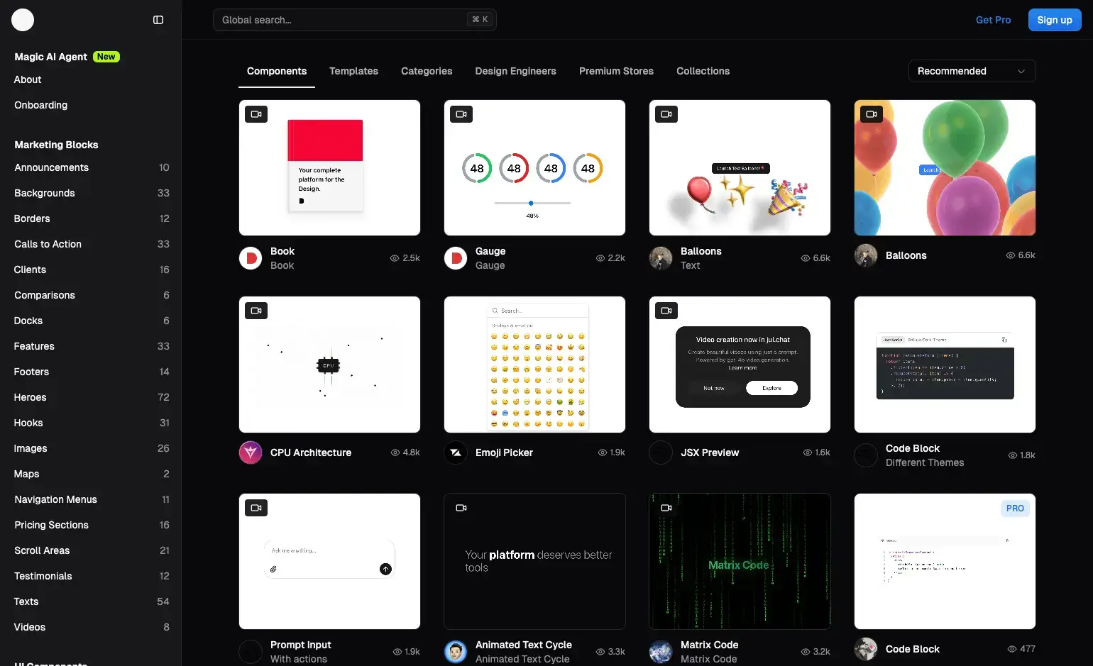 Component Marketplace Features: β Largest React Component Registry - shadcn/ui-based, Tailwind CSS, Radix UI components β AI Component Generator - Describe UI in plain English β AI generates multiple variations instantly β One-Command Install - npx shadcn@latest add "https://21st.dev/r/..." installs directly β Community-Driven - Developers publish, remix, and share components β Full Code Control - Components copy into your codebase β Interactive Previews - Live demos with videos before installation β 3D Components - Cutting-edge interactive 3D UI elements
