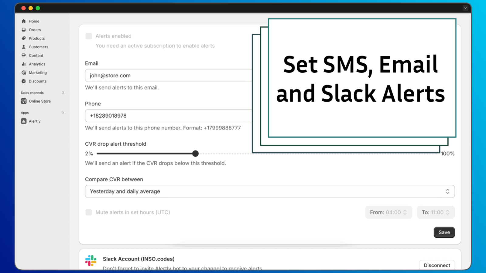 Get real-time alerts for CVR drops, stock issues, and store errors via Email, SMS, and Slack.