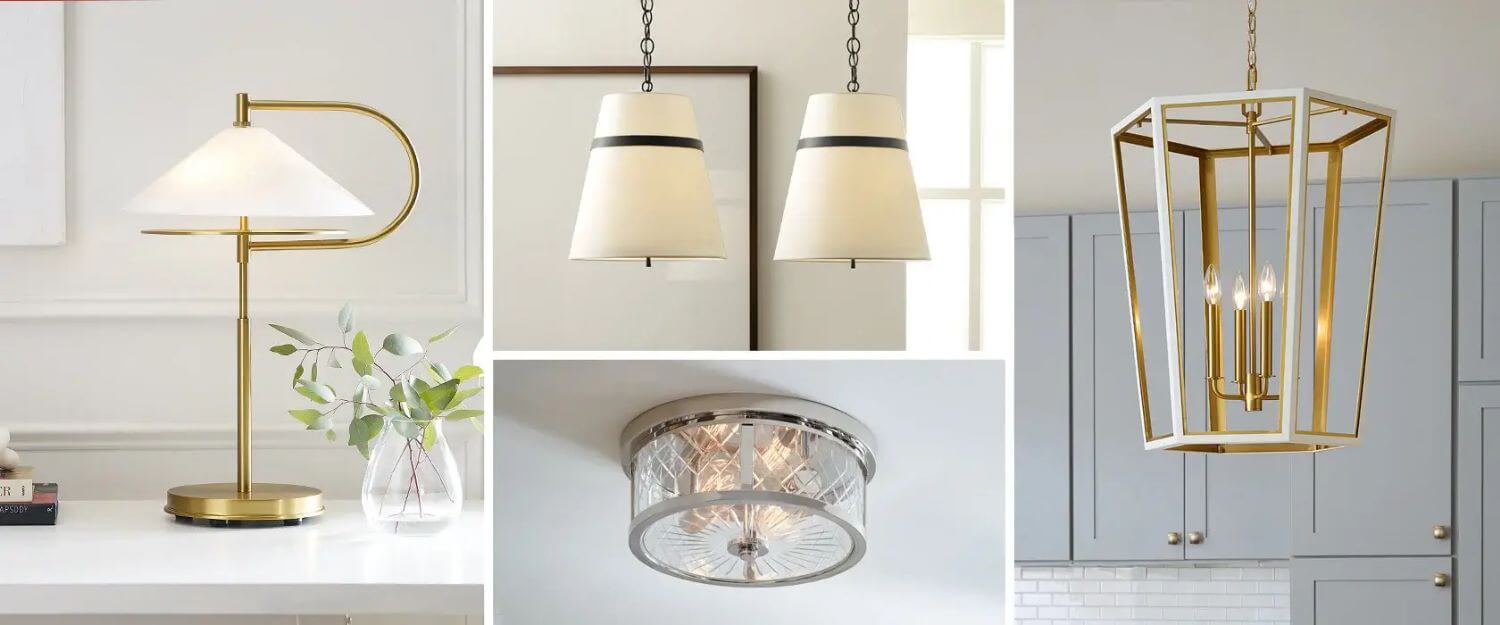 A comprehensive selection of lighting solutions—including ceiling lights, wall sconces, portable lamps, and outdoor fixtures—alongside ceiling fans, furniture, and home décor items such as mirrors, rugs, and wall art