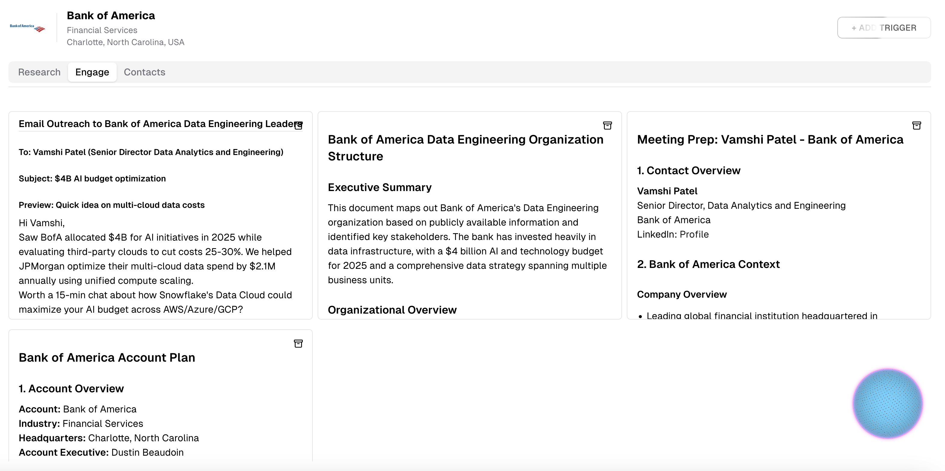 It uses AI to monitor accounts, generate insights, org charts, messaging, alerts, and personalized outreach materials.