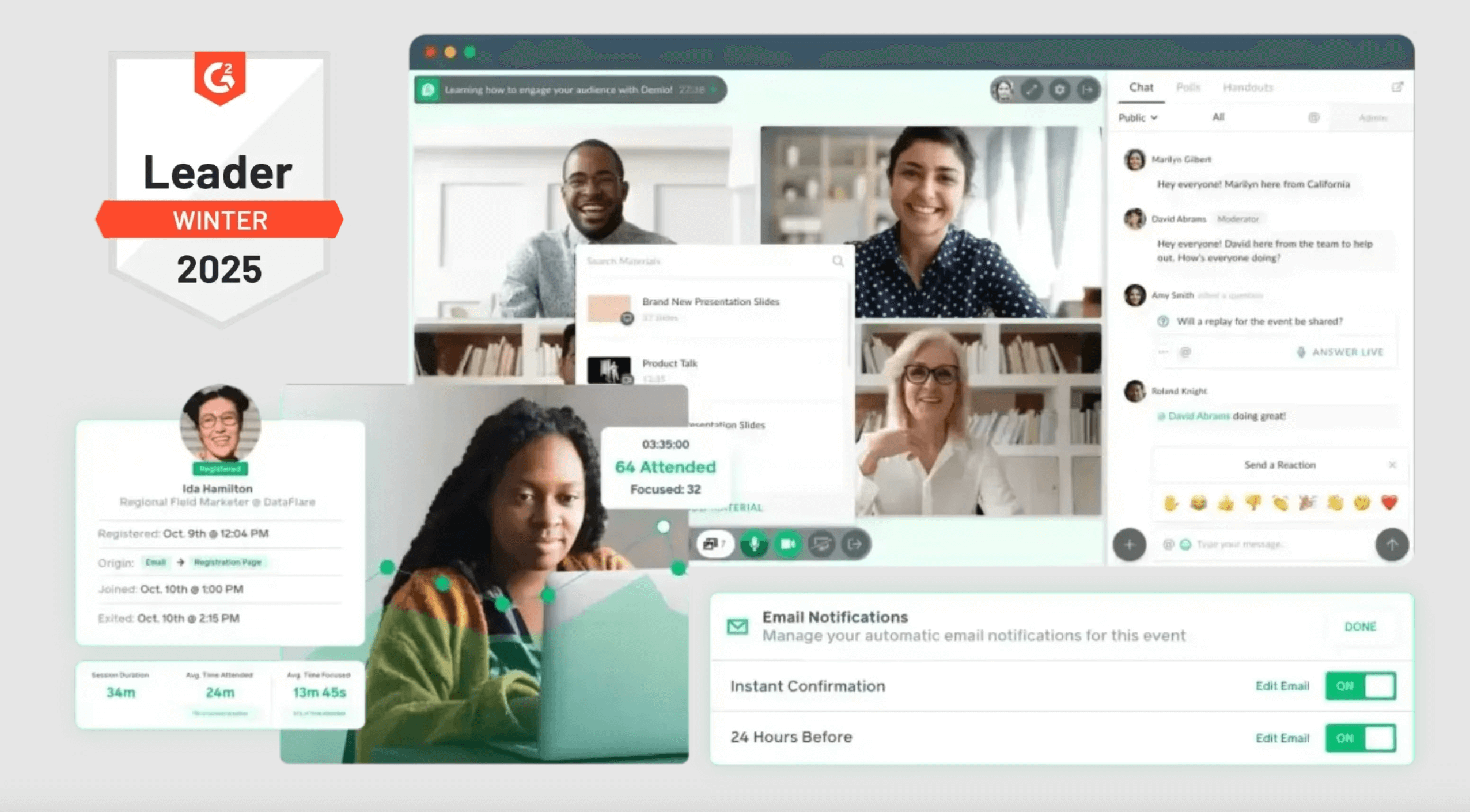 Demio is a browser-based webinar platform designed for marketers, sales teams, and customer success professionals. It offers a range of features to host live, automated, and on-demand webinars with a focus on engagement and analytics.