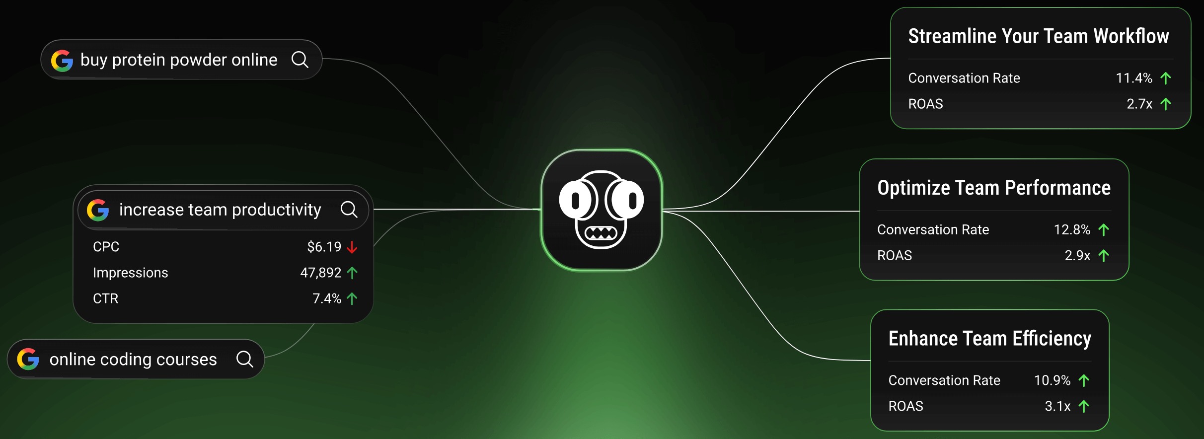 AI agents generate unique ad copy & landing pages for every search term, boosting relevance.