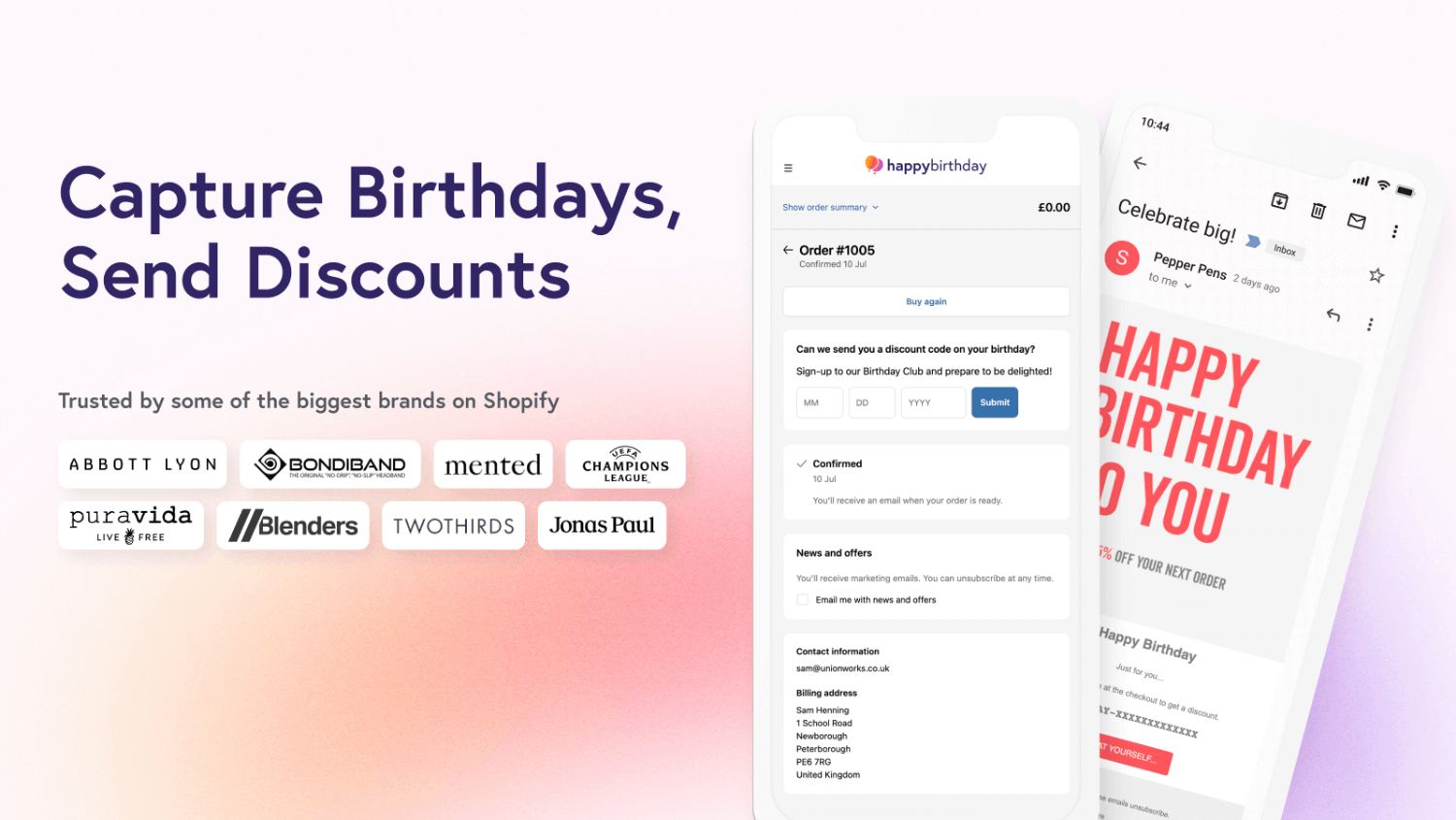 🎉 Automates birthday emails with personalized messages and discount codes 📅 Collects birth dates at checkout, POS, or landing pages 🧠 Tracks performance and revenue from birthday campaigns 🔗 Integrates with Klaviyo, Mailchimp, Omnisend, and more 🧍 Segment customers by age groups to personalize offers
