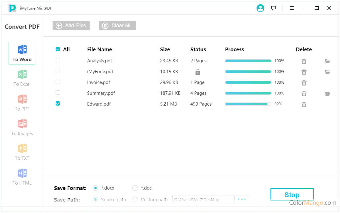 iMyFone MintPDF supports converting PDF files into different formats in batch at up to 30X faster speed. The output will maintain all the original font, layout and won't compress the file. There is no size limit and it can work with encrypted files as well. Takes only two simple steps to convert PDF files to Word, Excel, PPT, Image, TXT, and HTML files.