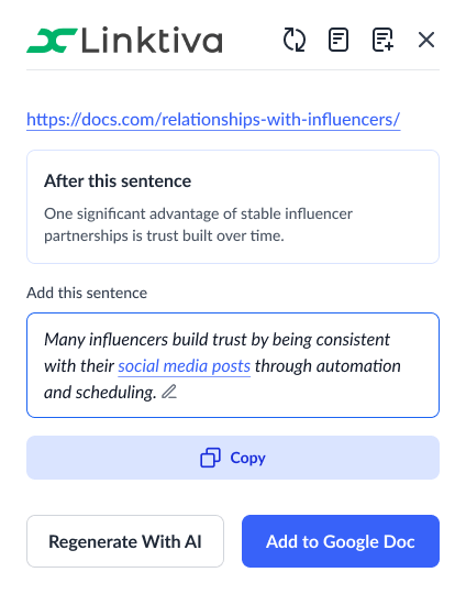 Smart AI assistant finds anchor text in your content and auto-suggests link placements.