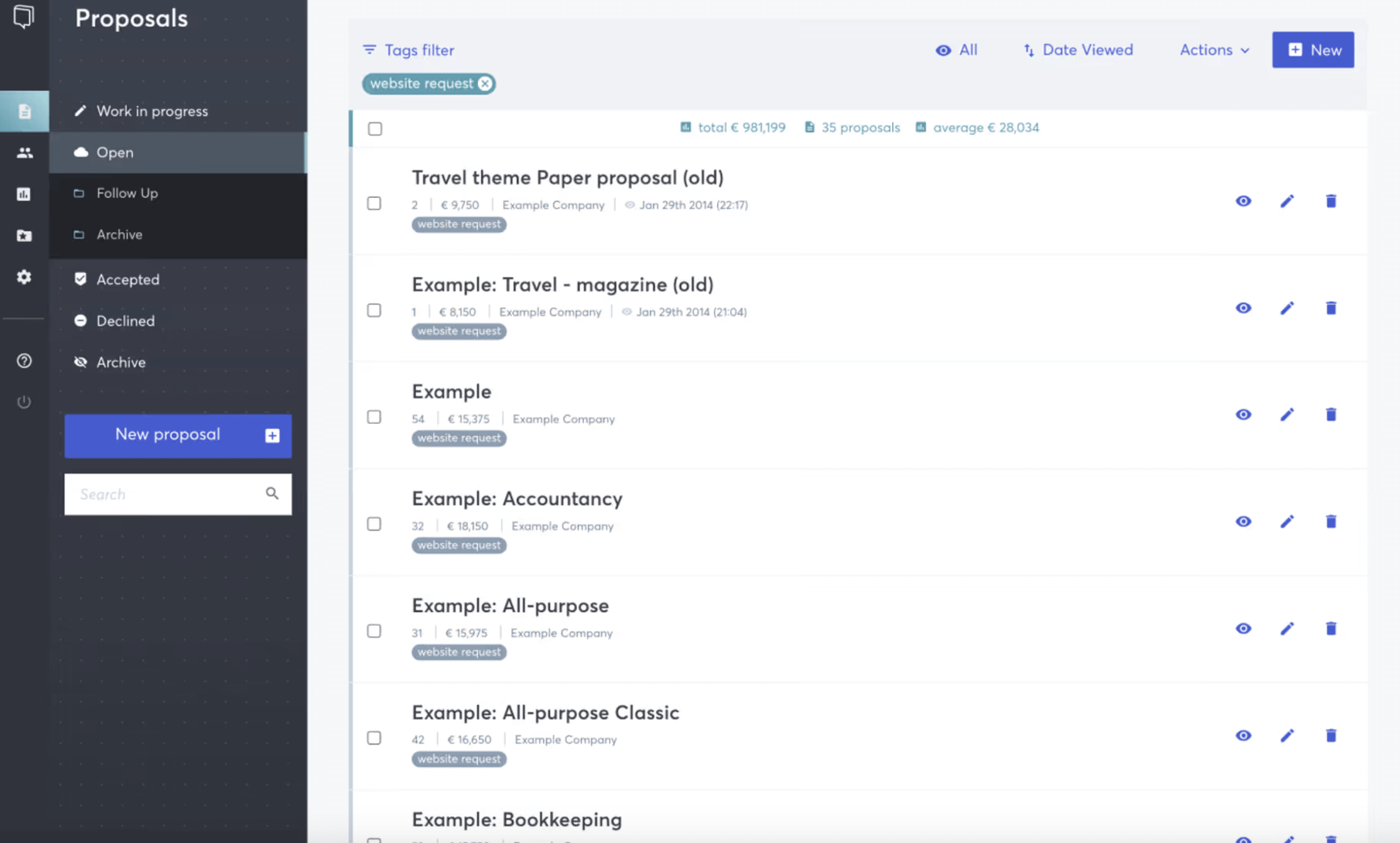 Interactive, branded proposals: embed videos, dynamic pricing tables and input forms for engaging client experience.