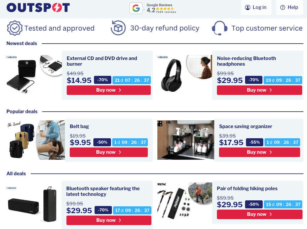 āOutspot offers a diverse selection of practical and affordable products, including LED motion-sensor light, sensor trash cans, smartwatches, polarized sunglasses, multi-port USB flash drives, wireless doorbells, and universal electric toothbrush heads for everyday tech, home, and lifestyle needs.