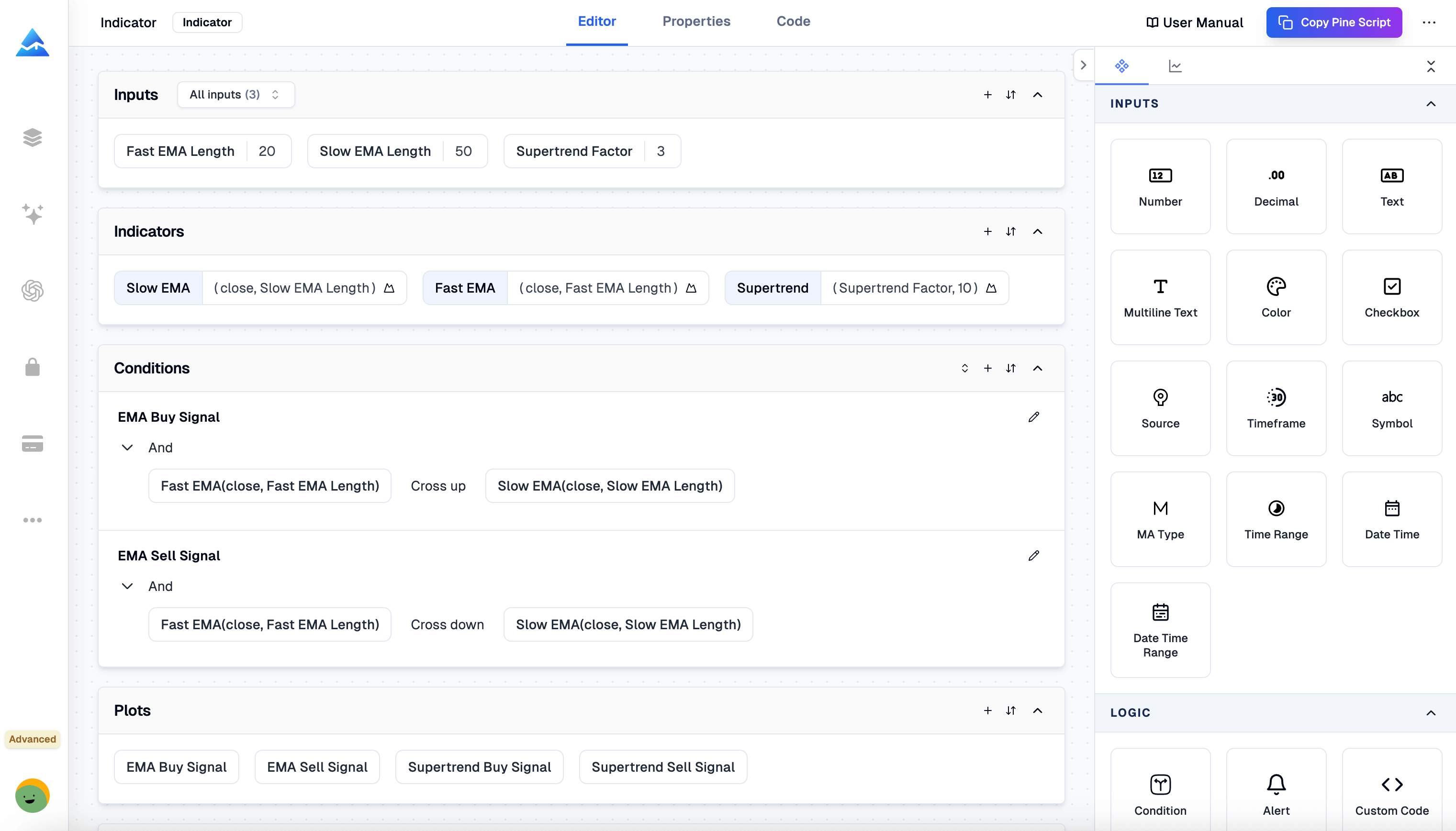 AI-powered no-code Pine Script generator and editor for TradingView, creating indicators and strategies instantly.
