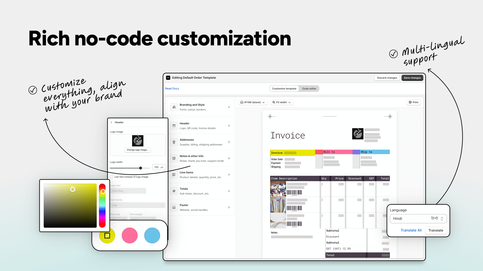🧾 Auto PDF Invoicing — Instantly sends tax-compliant invoices to customers' inboxes 🛠️ No-Code Template Customizer — Easily modify invoices with drag-and-drop editor 📤 Multi-Channel Delivery — Print from POS, Shopify admin, or show download links to customers 🧬 Custom Data Support — Add metafields, tags, or attributes to your documents 🤖 AI-Powered App Migration — Seamlessly migrate from other invoice apps using AI