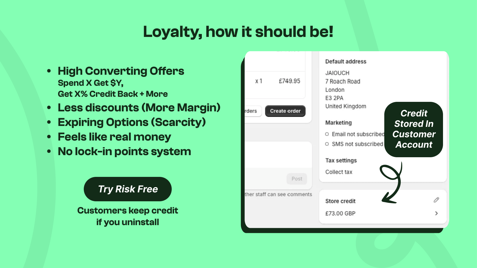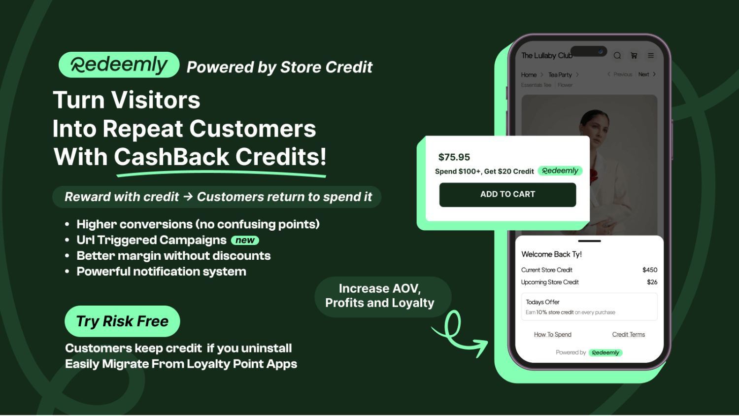 💸 Reward customers with store credit instead of discounts 🛍️ Higher spend = higher cashback = more repeat purchases 🧾 Seamless setup with native Shopify integration (no points system) 📈 Boost margins and LTV with detailed performance insights 🔁 Email alerts bring customers back to redeem credit