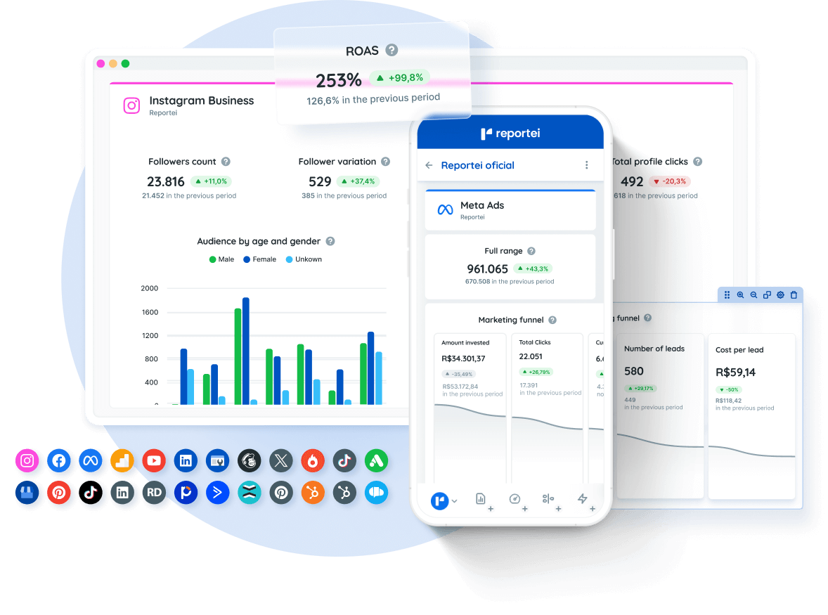 Reportei merges automation, multi-channel integration, AI insights, dashboards, and reporting in one tool — reducing time and fragmentation across separate analytics tools.