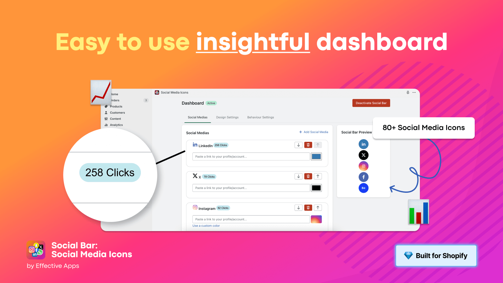 Add a floating bar of 80+ social profile + share icons to your product pages in one click to boost social proof and follows.