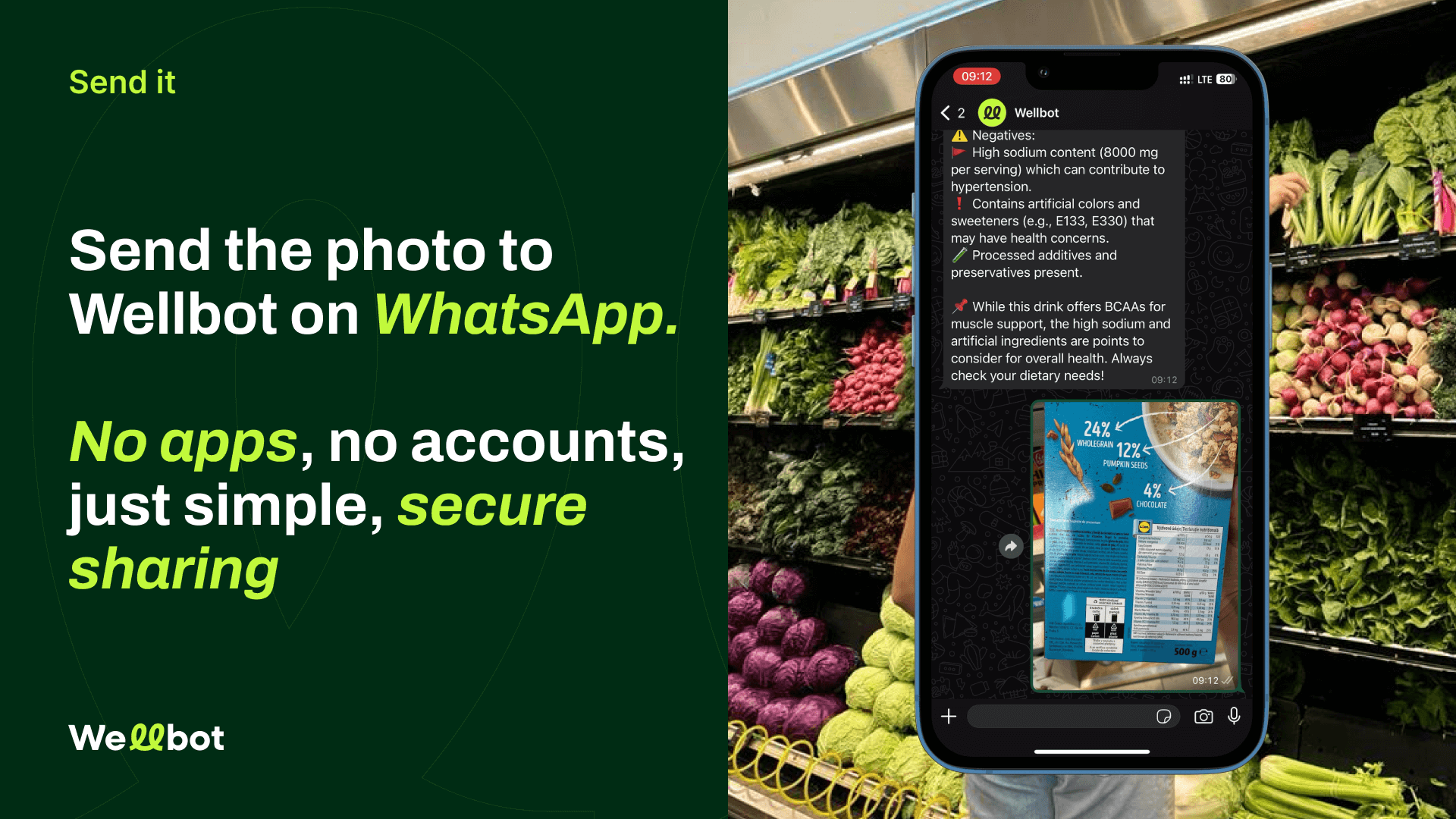 Wellbot turns confusing food labels into clear, personalized insights in seconds. Just send a photo of a product's nutrition label via WhatsApp, and Wellbot will instantly reply with: