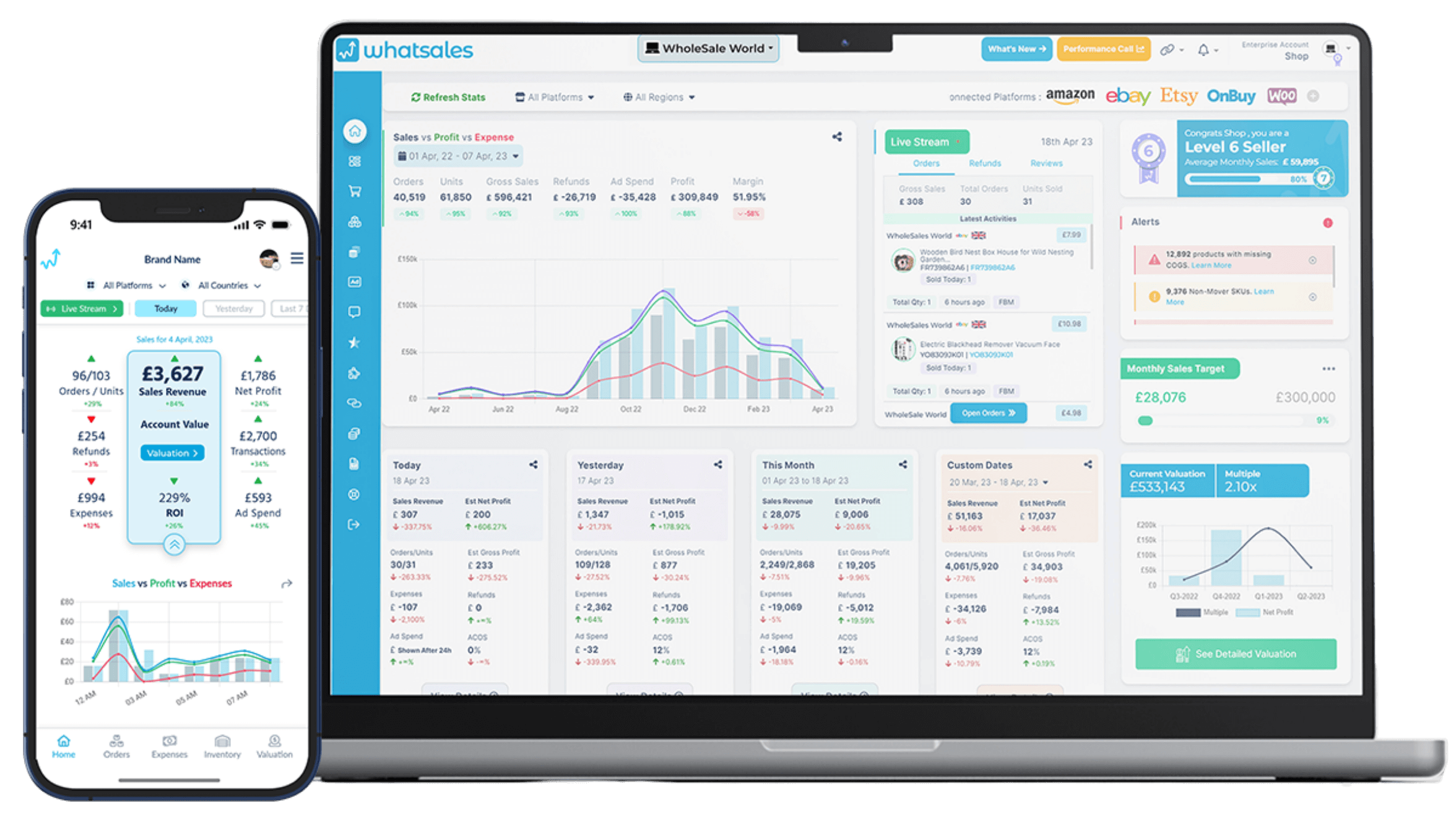 WhatSales is a profitability analytics platform designed for ecommerce sellers managing multiple sales channels. It aggregates data from marketplaces like Amazon, eBay, and Shopify into a unified dashboard. Users can track revenue, costs, fees, inventory levels, and product performance in real time. The platform helps sellers analyze profitability, monitor sales targets, and make data-driven business decisions.